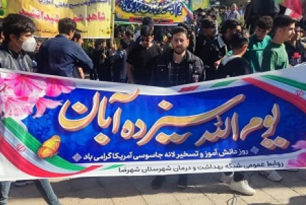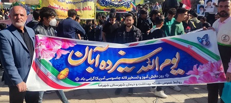 همزمان با یوم الله 13 آبان و روز دانش آموز، مدیریت ،کارکنان شبکه بهداشت و درمان و بسیج با حضور خود در این راهپیمایی، همراه با دیگر اقشار جامعه انزجار خود را از مستکبرین و منافقین اعلام کردند.
